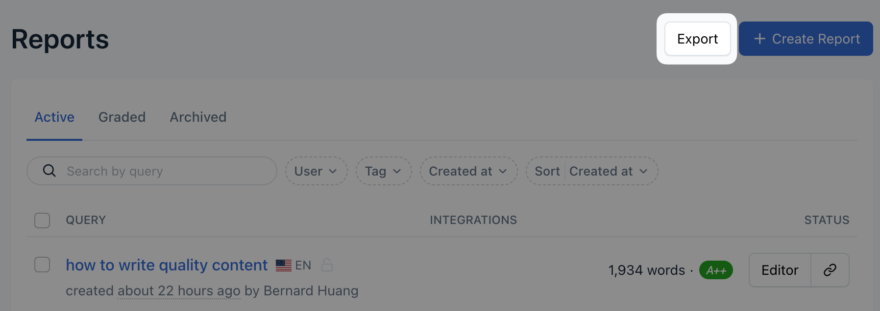 In order to export up to the first 5,000 Drafts on your Clearscope account, navigate to the “All Drafts” screen and select the “Export” button.