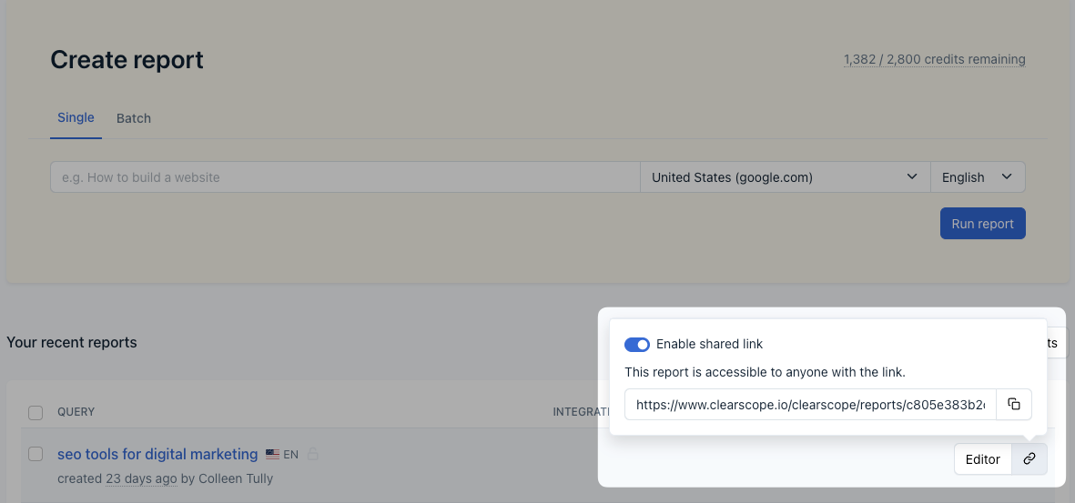 Clearscope Drafts can be “shared” by clicking on the dropdown next to a report and toggling the share link.