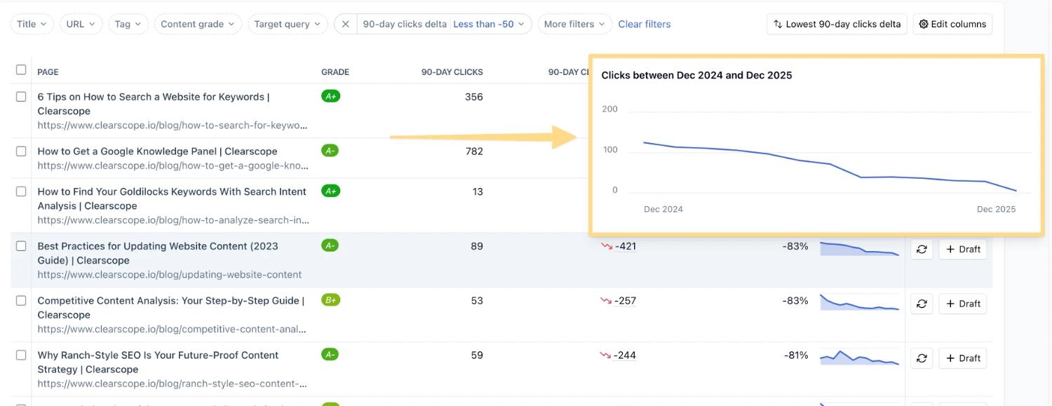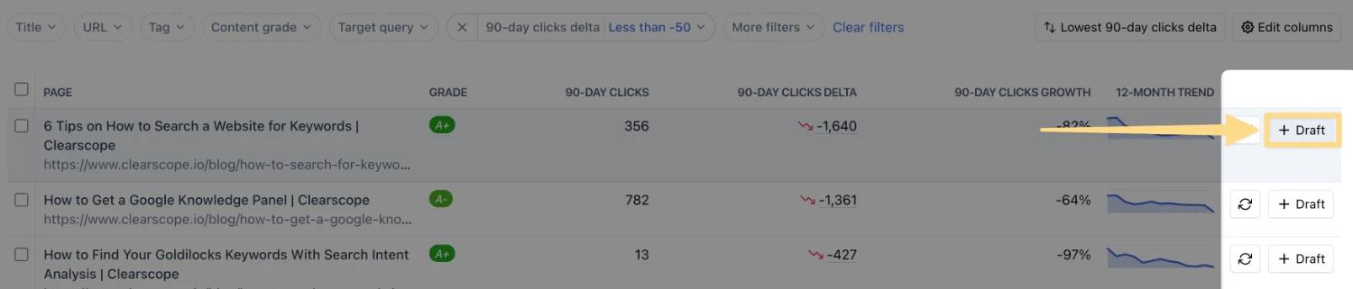 Updating outdated sections, expanding topical coverage, or improving alignment with user intent can help reverse the decline. If a page clearly needs work, you can generate a Clearscope Draft directly from the view to get targeted recommendations on topical coverage, phrasing, and structure.