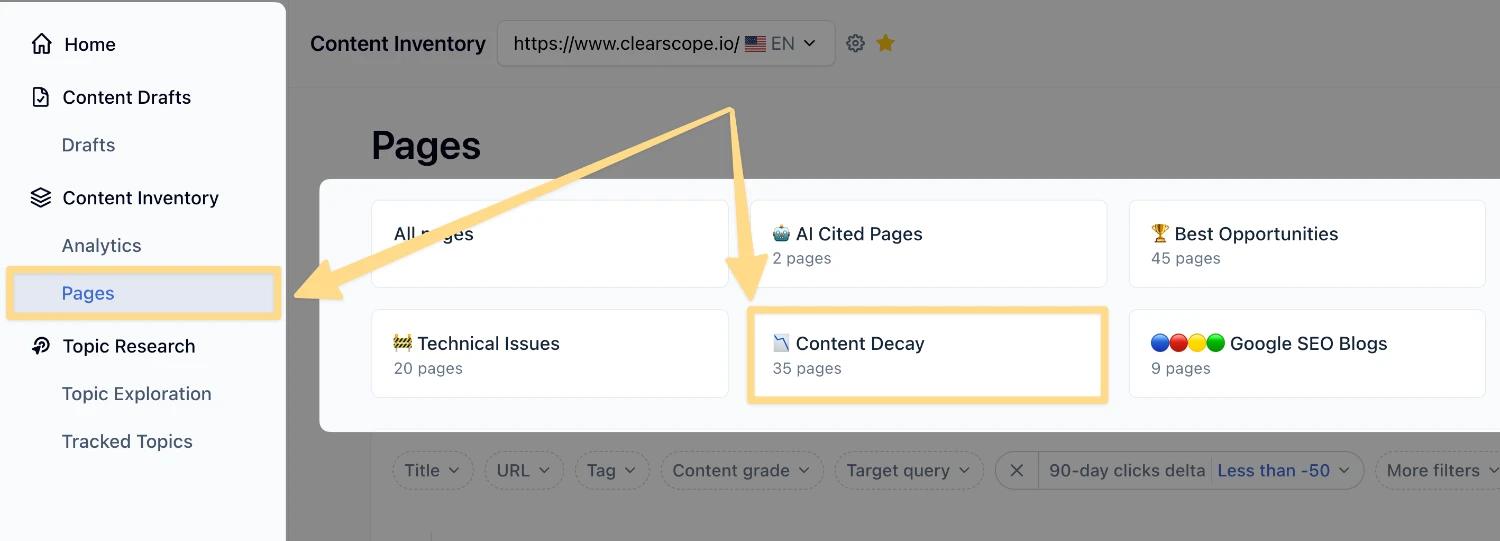 By prioritizing pages with confirmed decline, you invest effort where it’s most likely to produce quick, measurable gains without rebuilding from scratch. The Content Decay Content View is your launchpad for keeping published content fresh, relevant, and competitive.