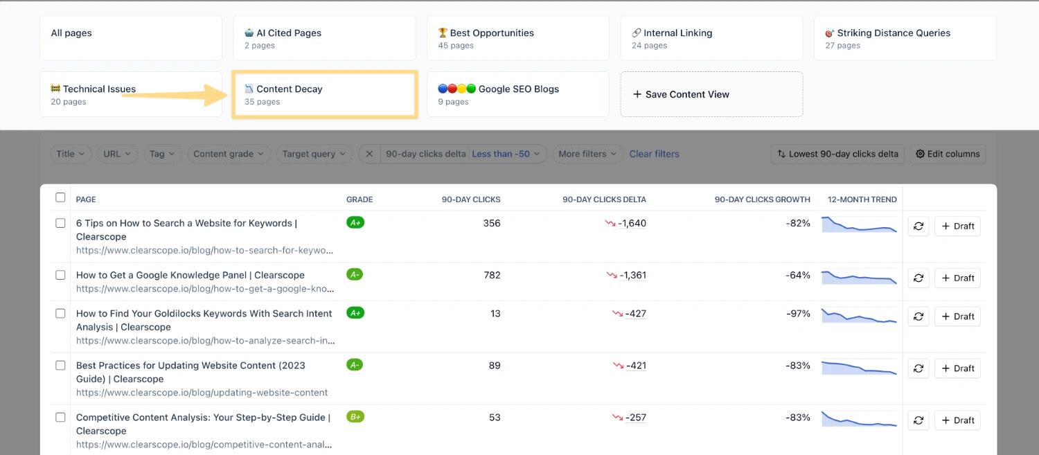 Content rarely stops performing overnight — it softens gradually. The Content Decay view crystallizes those slowdowns, showing you where a modest refresh can recover clicks and strengthen authority.