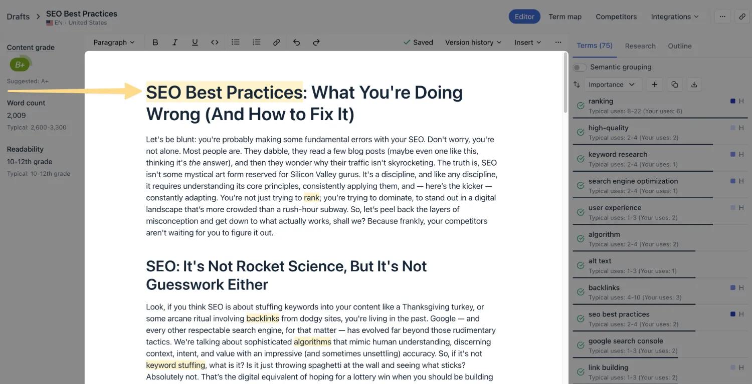 Now it’s time to review and tailor the AI-generated outline to better reflect your brand voice and audience needs. While Clearscope offers a solid foundation, we recommend refining the structure to highlight your unique value proposition.