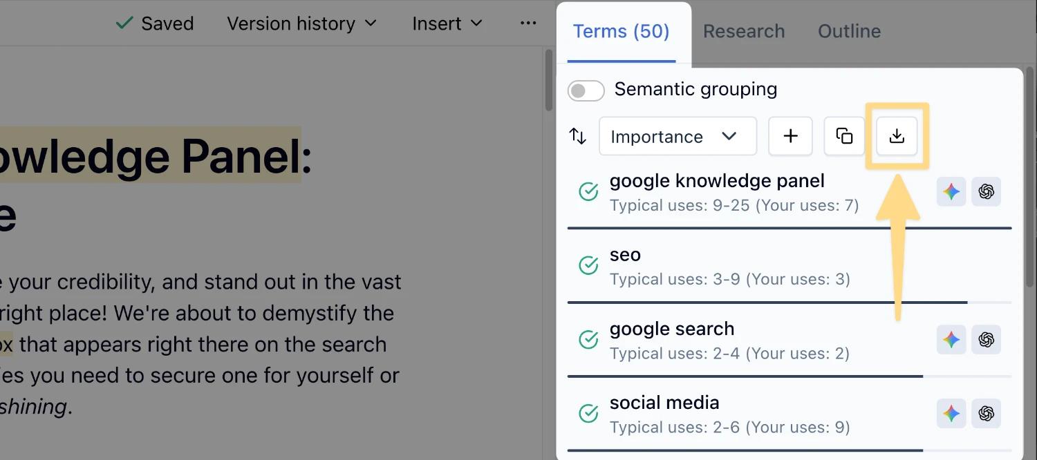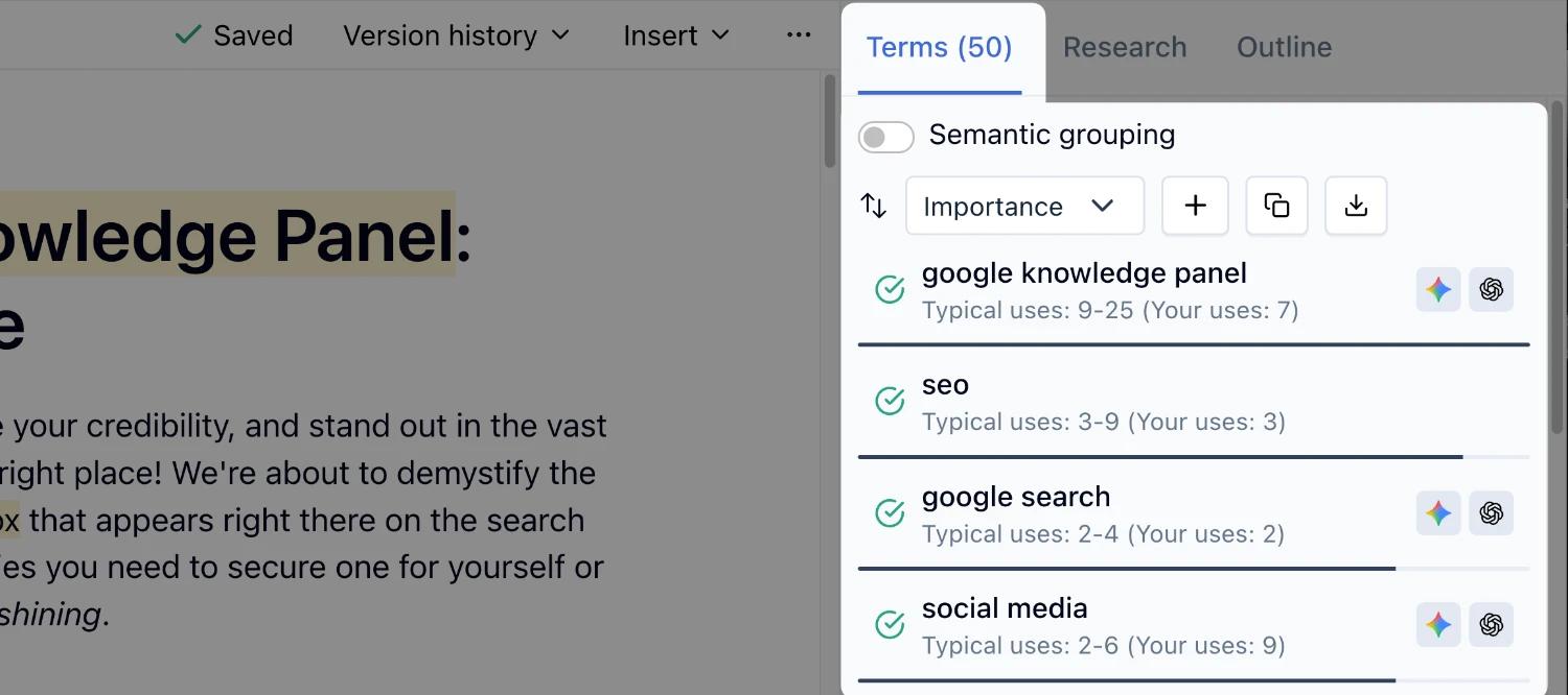 2. Once the Editor opens, you will see the Terms tab is the default view on the right-side bar. The Terms tab highlights the number of relevant terms for the query according to the Draft analysis (number in parentheses next to “Terms”) as well as the list of the recommended terms to cover for topical relevance.