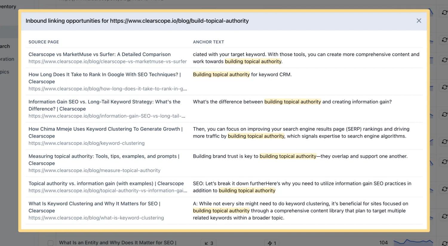 Clearscope analyzes all of your imported pages, identifies the top three queries for each article based on impressions and clicks, scans your imported pages to see where these ranking queries appear in other pages, and then provides recommendations for links that connect them. This makes it easy to see where your content could be better interlinked to support both SEO and user navigation.