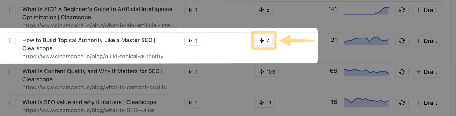 Within the Internal Linking view, you’ll find a column that shows how many internal links already exist between related pages. Next to it, the lightning bolt icon opens a list of recommendations for new links.