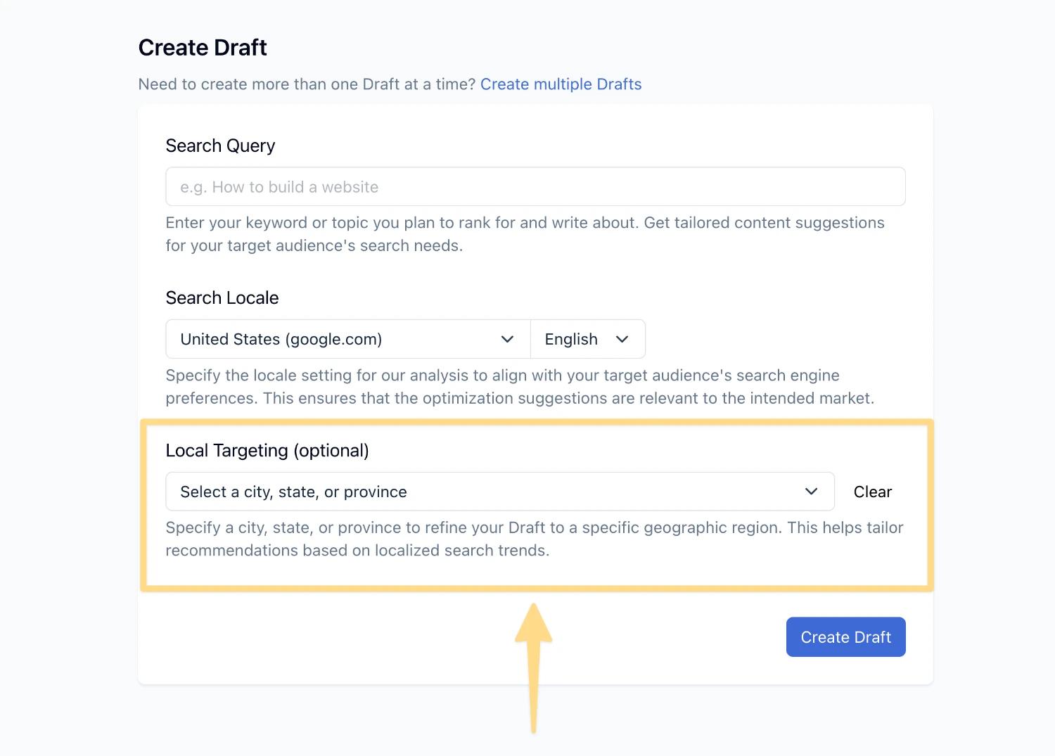 Local SEO Targeting is a Draft-level setting that lets you optimize content for specific cities or regions. In addition to our terms, questions, and heading recommendations you'll also gain location-specific insights that reflect how people actually search in your target area.