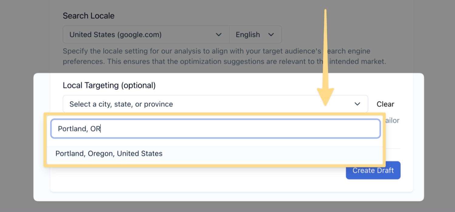 Local SEO Targeting solves this by bringing city-level intelligence into your Clearscope Drafts.