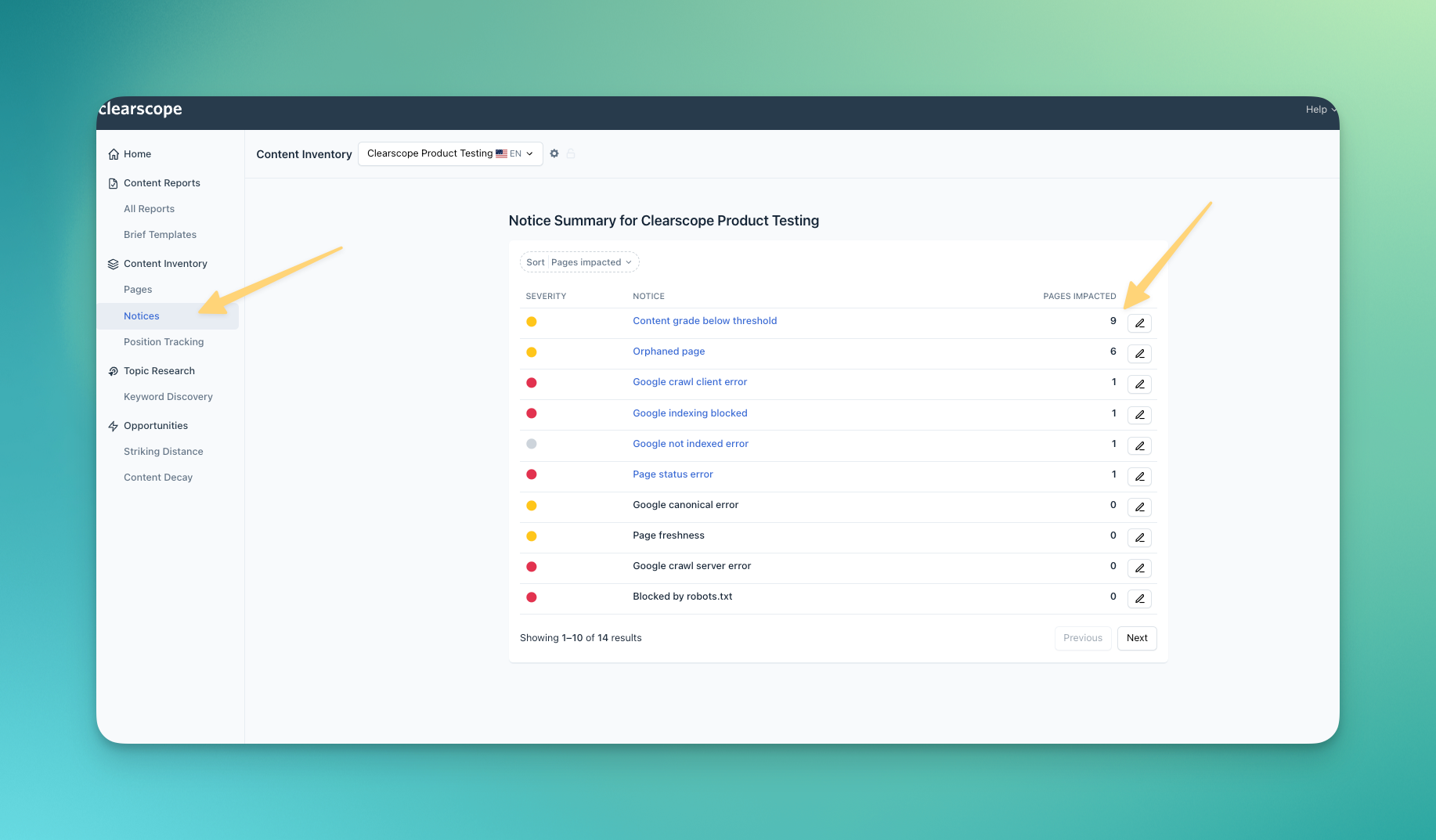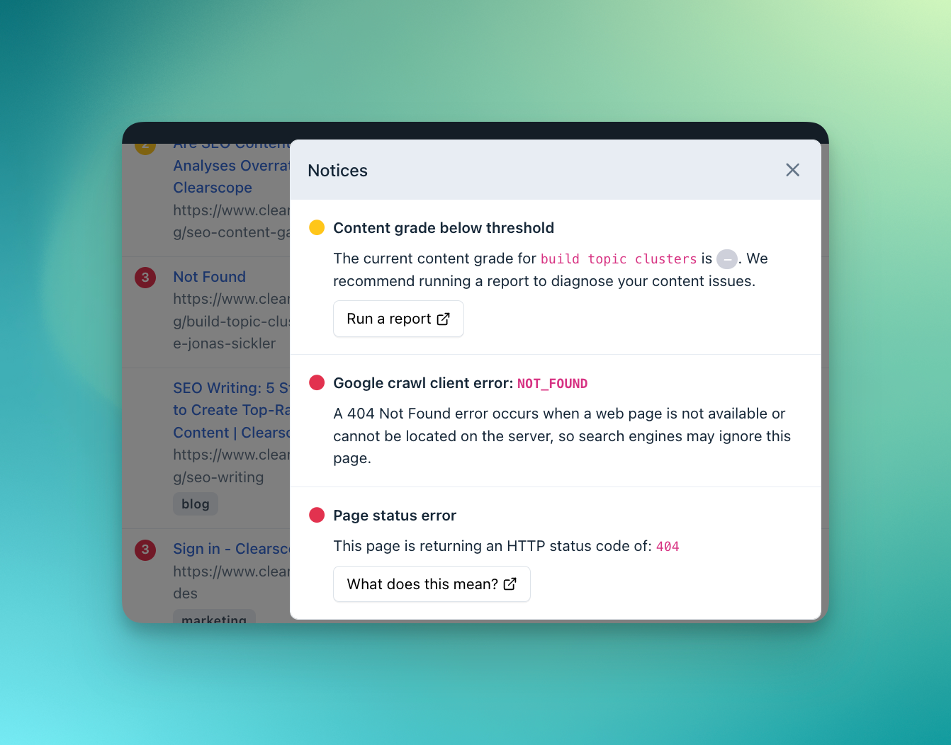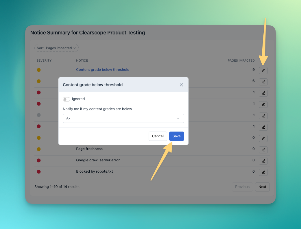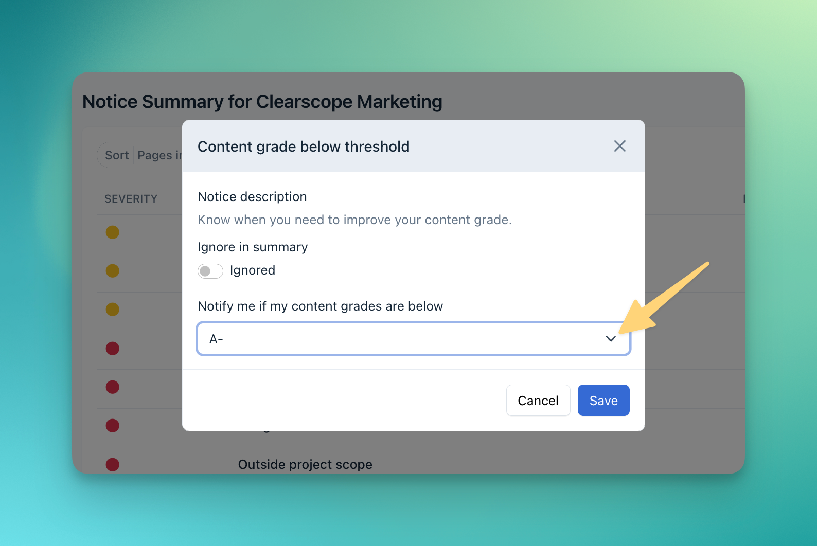 For example, you can customize Clearscope to notify you when a page in your Content Inventory: