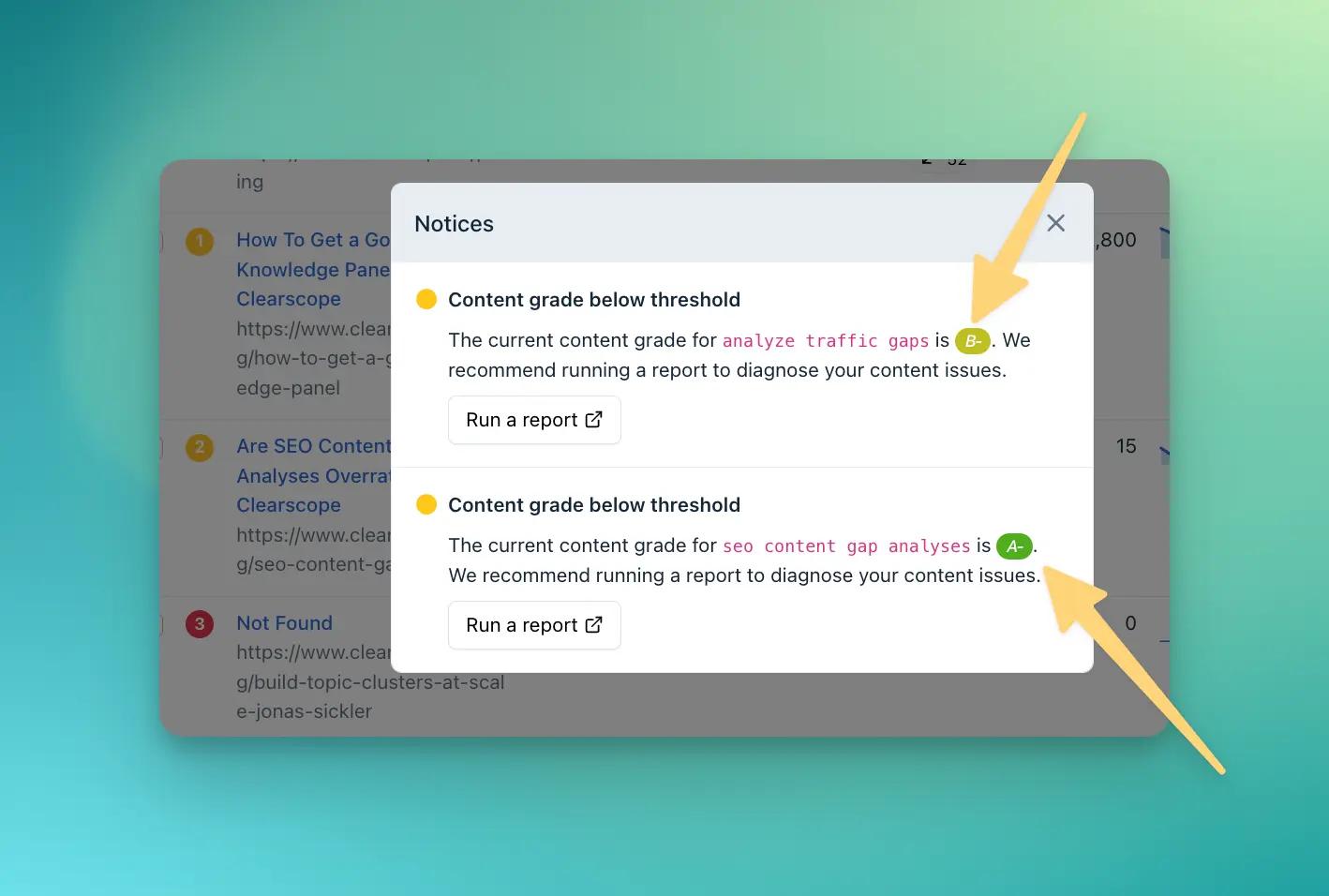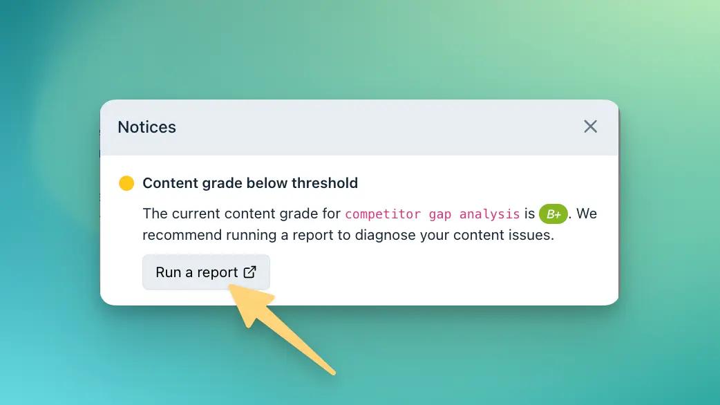 Because content topics change over time, Page-Level Notices will also alert you when a piece of your content drops below a certain content grade threshold.