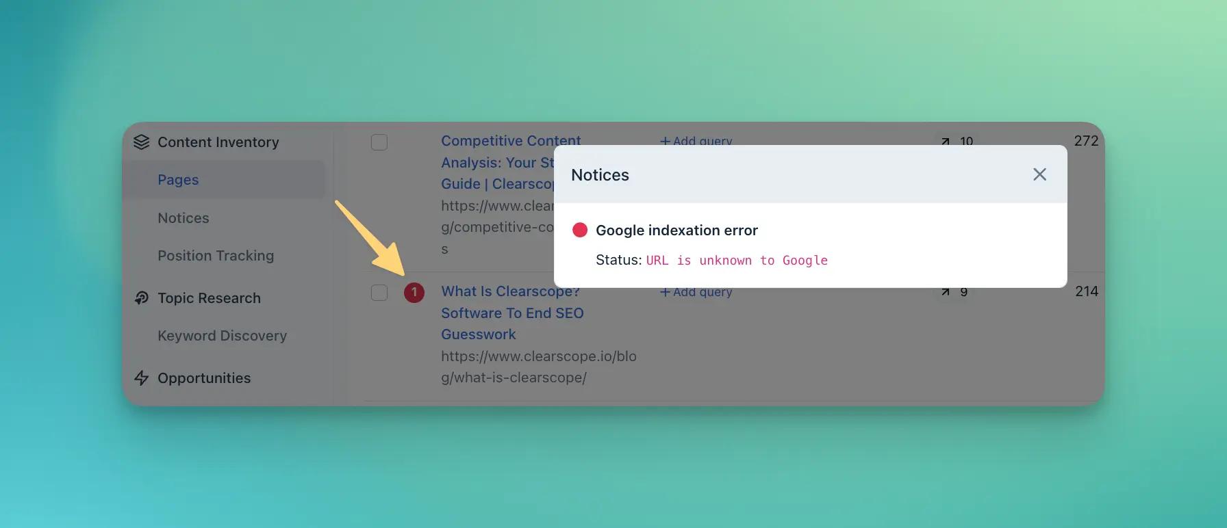 We use Google Search Console’s API to pull the indexation status of pages in your Content Inventory so you know when this type of error happens.