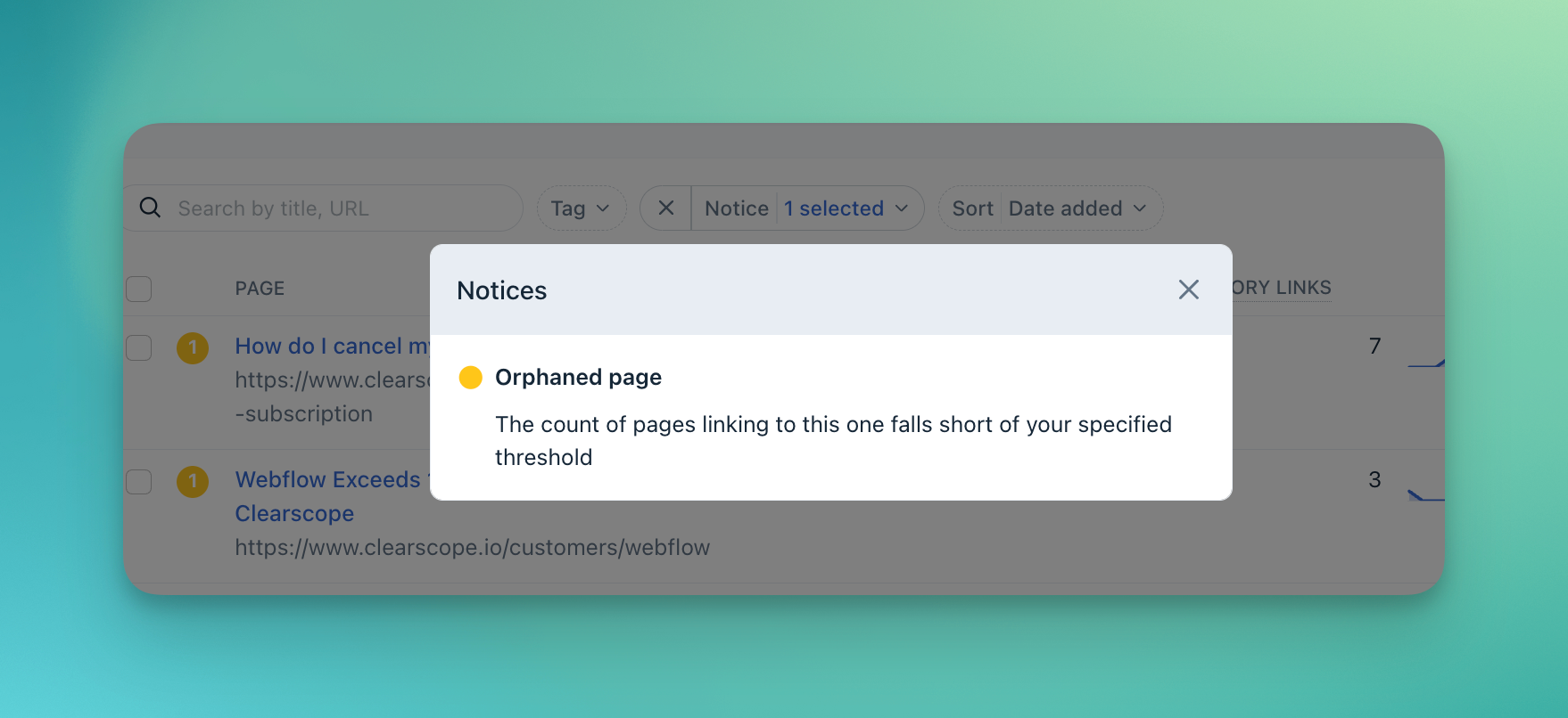 An Orphaned Page is a page without any internal links to other pages tracked in your Clearscope Content Inventory.