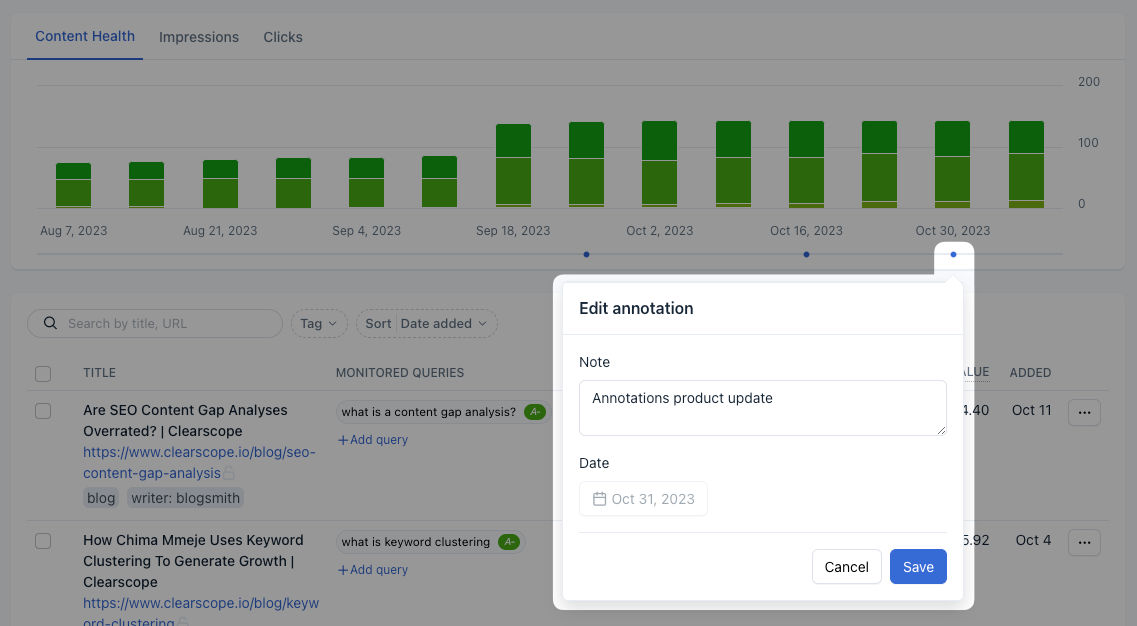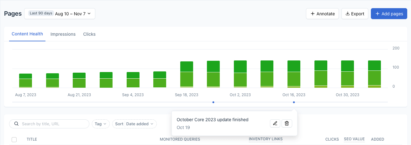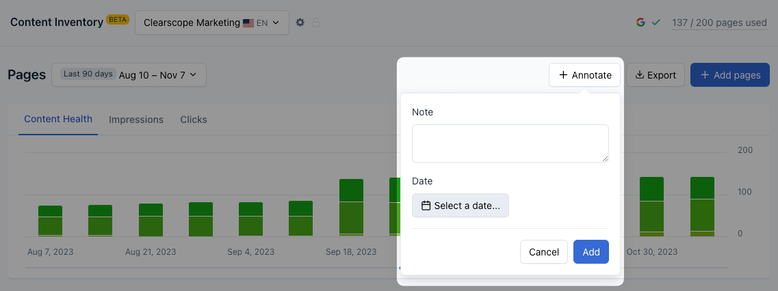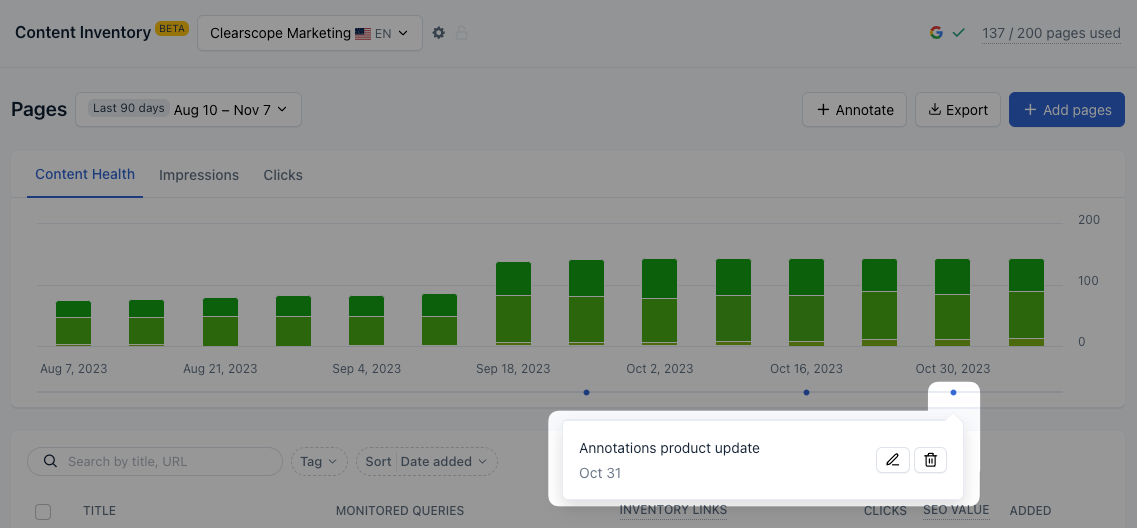 Project-level annotations allow you to add event details and visual markers to your Content Inventory to easily comment on what took place as well as track how they might have influenced your content health