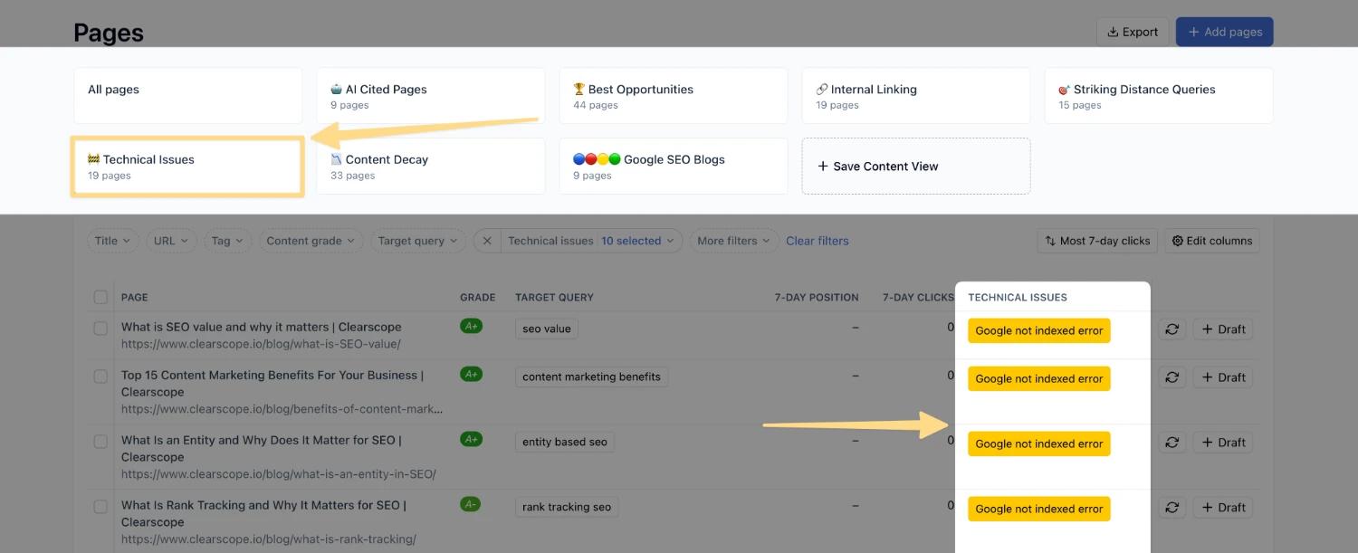 Search engine visibility starts with proper indexing. If your pages aren’t being crawled or indexed, they won’t appear in search results - no matter how well-optimized the content is. The Technical Issues Content View helps you catch these problems early, so you can take action before they impact traffic, rankings, or performance.