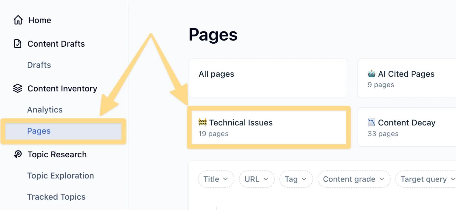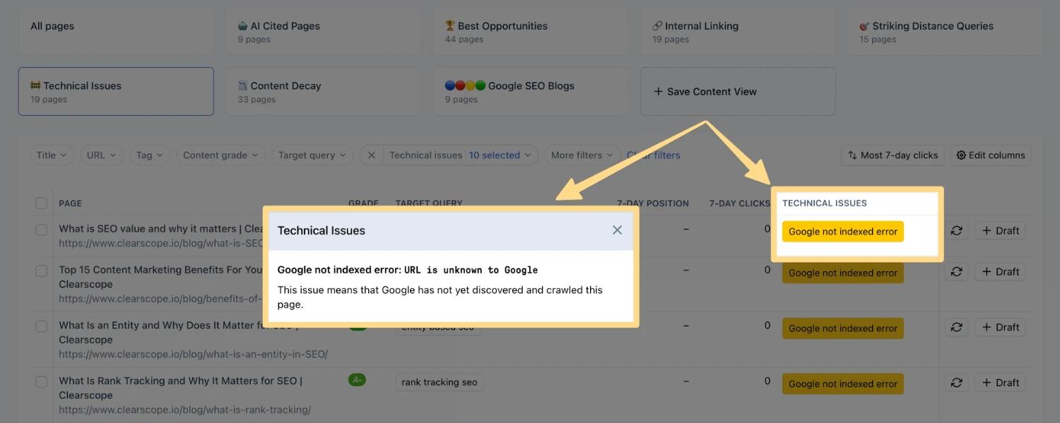 The Technical Issues Content View is your go-to resource for identifying and resolving indexing blockers across your content inventory. By surfacing common technical errors and providing clear explanations, this view helps you maintain a healthy site structure and maximize your content’s visibility in search engines and also AI platforms.